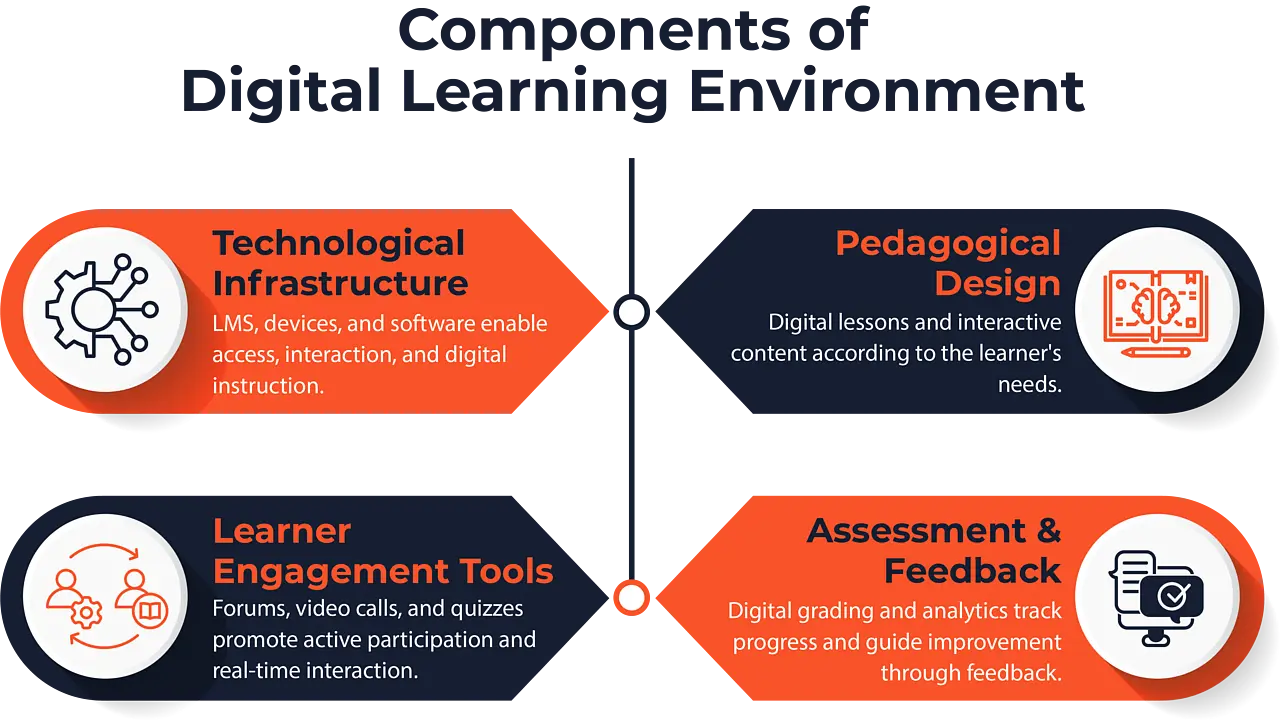 A digital learning environment integrates tools like virtual classrooms, multimedia content, cloud platforms, and interactive applications to support instruction, active participation, collaboration, and assessment.